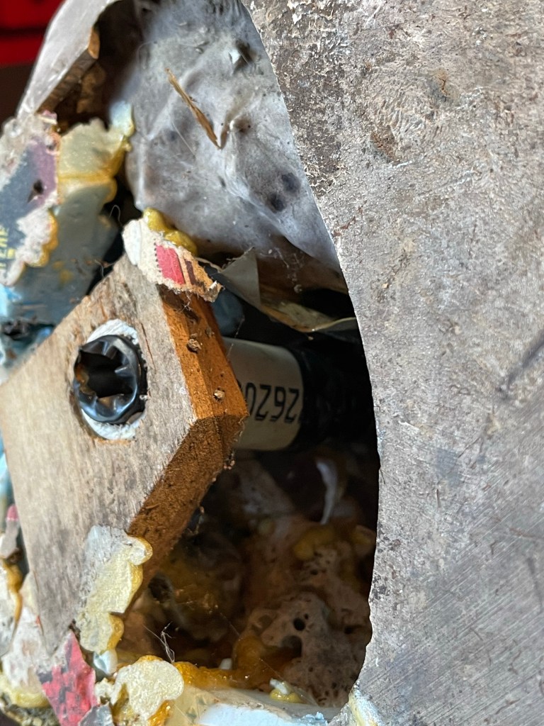 Over the next few weeks, I worked on putting the angel back together. I used a piece of pvc pipe on a square of wood to stand her back up. Pieces of aluminum cans were glued to the inner walls of her hollow body to hold the broken pieces in place after they were glued. Gorilla Glue became a good friend!