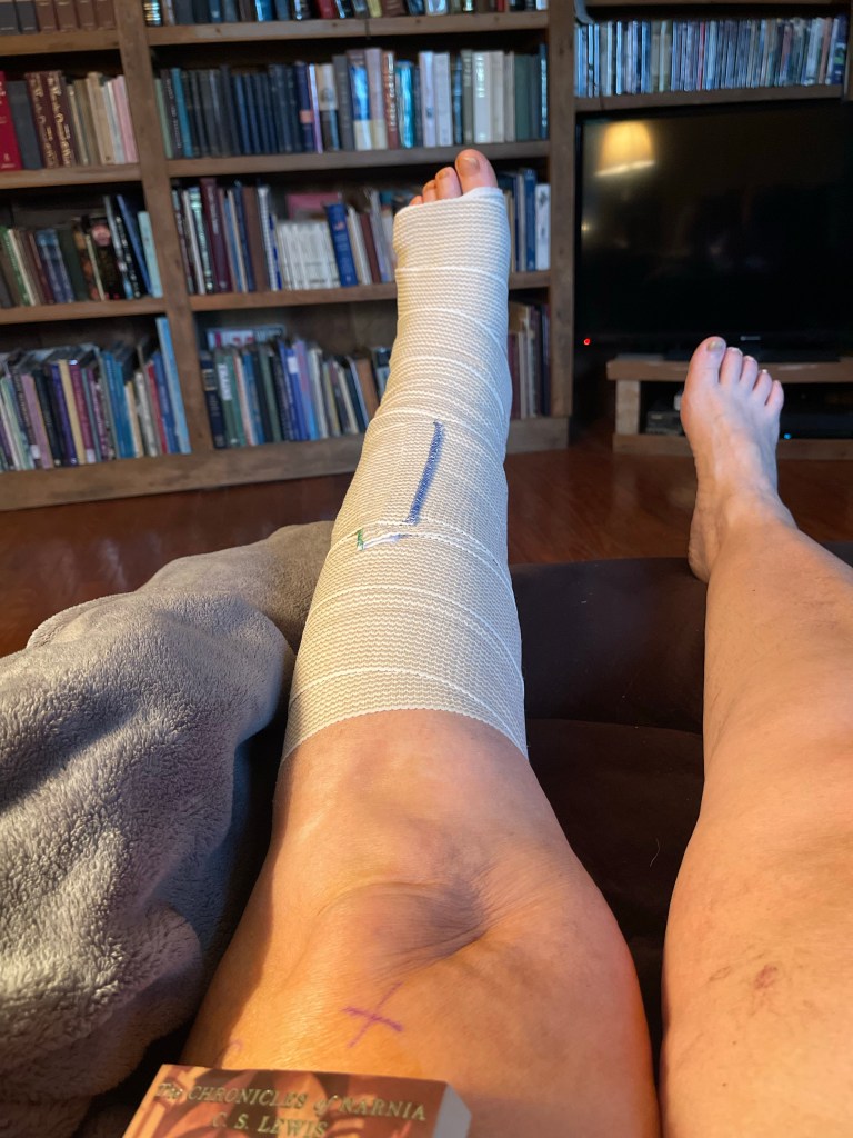 I started down a muddy path toward a bridge across the creek , and my feet went out from under me. The right foot went straight out and was safe, but the left foot twisted spectacularly and I heard a loud “POP!” I thought “Uh-Oh. That sounded bad!” It was. I had broken two ankle bones.
