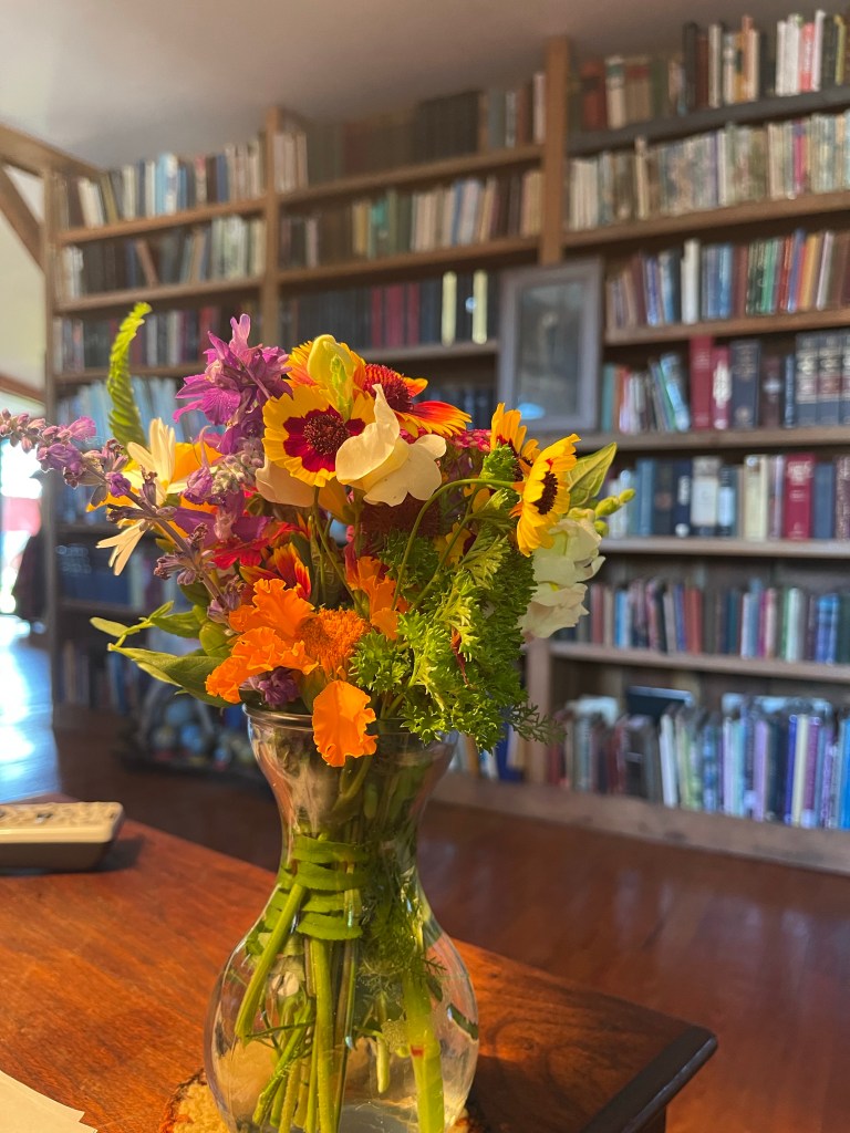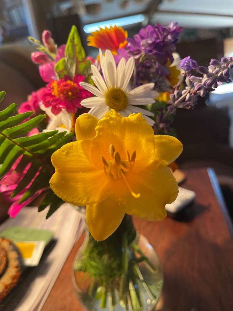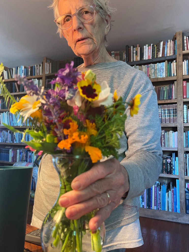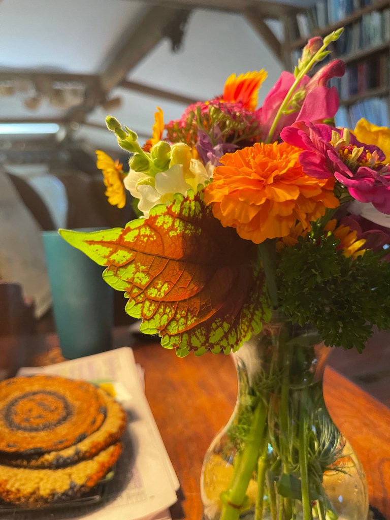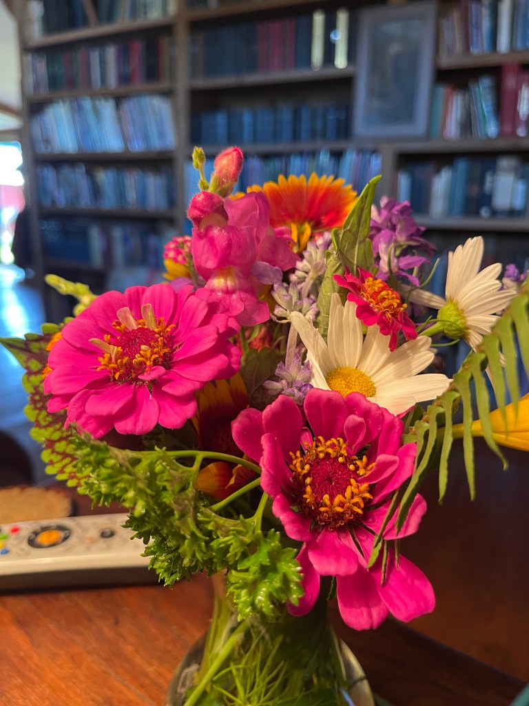 Mom was out watering in the garden, and decided I needed a bouquet of flowers to brighten my day. She packed a lot of goodness into a small vase!