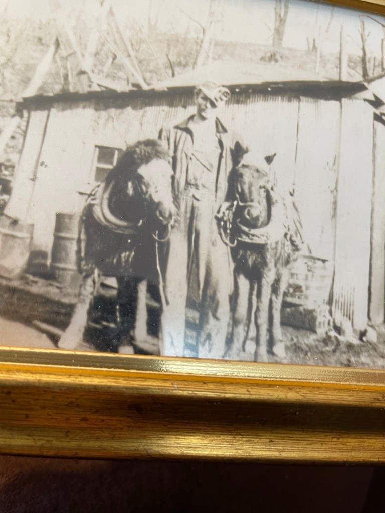 My father was a deep-vein coal miner. He was born in 1913, and went into the mines with his father when he was just 13. Imagine. Now it would be classified as “child labor” and was then! We lived in western Indiana, a prime location for coal. The shafts went deep into the earth—1-1/2 to 2 miles long. He was the “mule skinner.” He had 2 mules that pulled the car down into the mine. The men picked the coal off the walls with pickaxes and loaded it into the cars. It was the job of the Mike’s to pull it out. And they didn’t like it. They were stubborn and refused to go sometimes. And he MADE them. So if at times he told you, you were “stubborn as a mule,” it was not a compliment! Often at night when he came home his hands were covered with bites. And his legs with bruises where they had kicked him.
